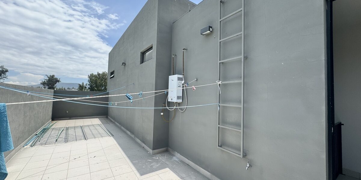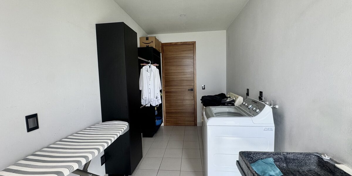 la casa tiene escalera de servicio que te conecta a la planta alta y a una recamara de servicio con baño completo, patio de tendido amplio y cuarto de lavado.
