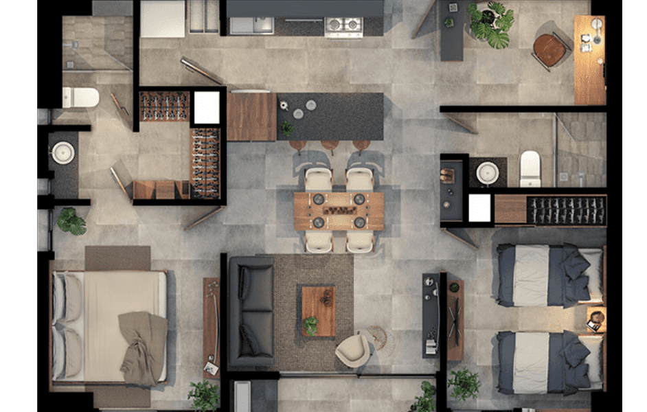 Departamento ubicado en Anuva Residencial, en un segundo nivel con una terraza privada de 23.60 mts2 con orientación a Av Naciones Unidas.