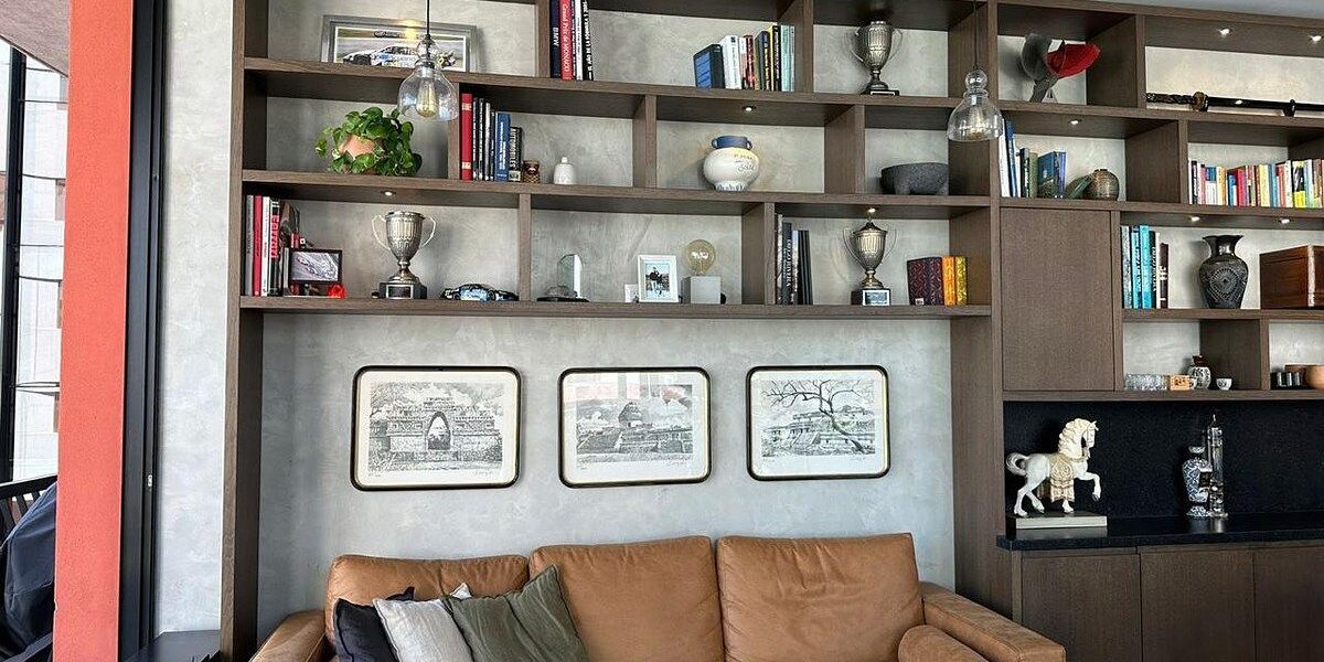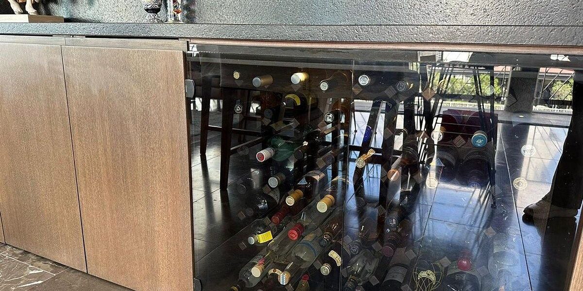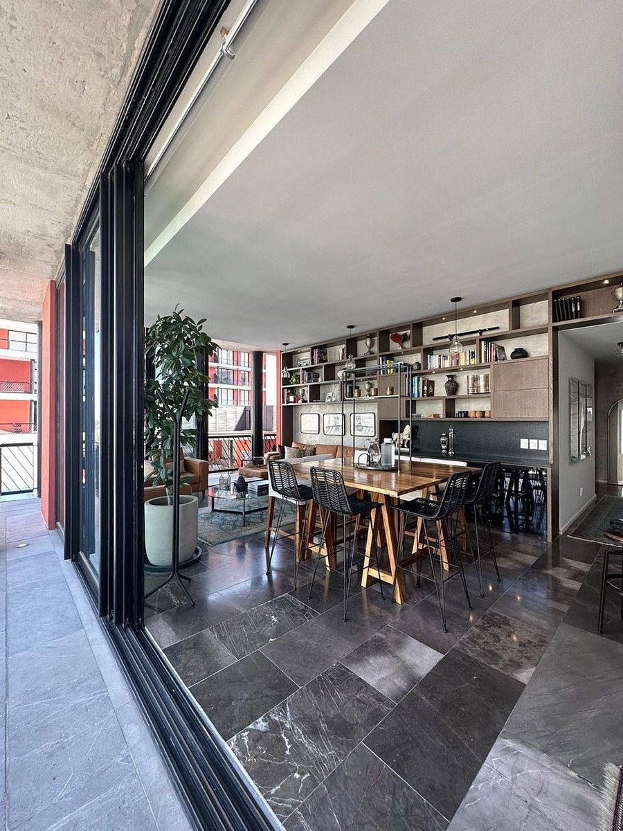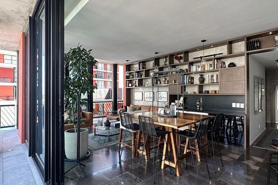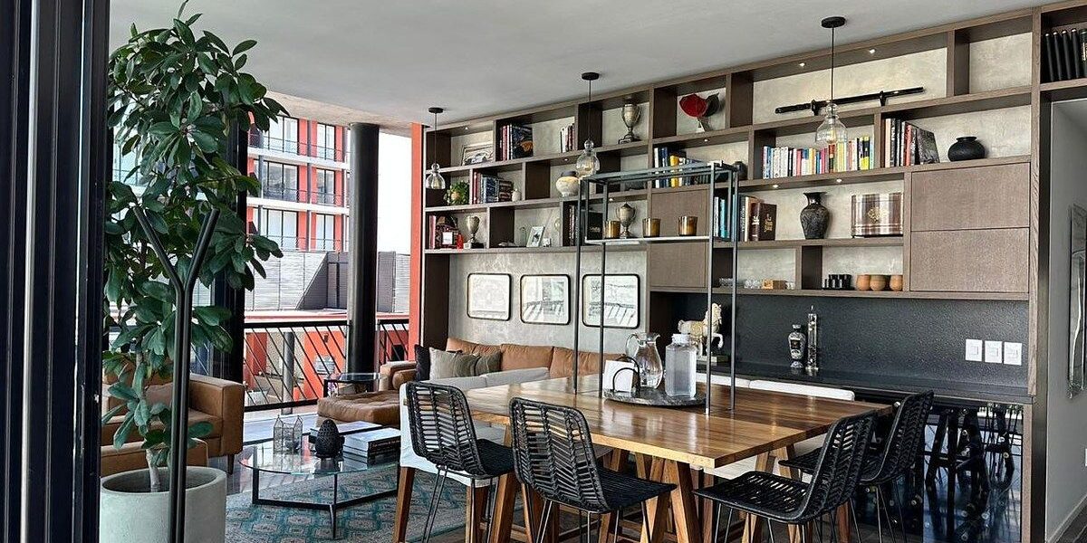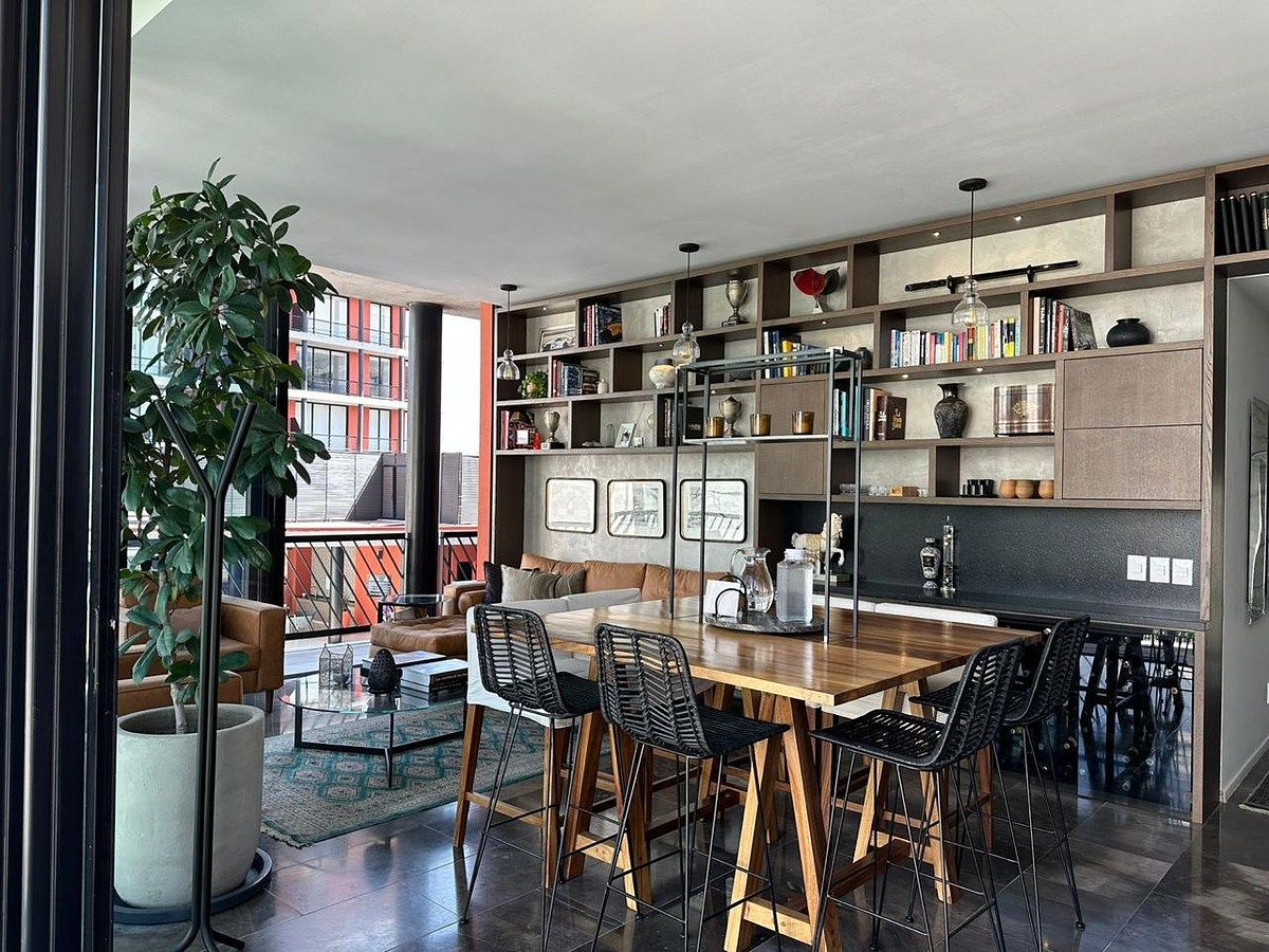 Area de sala comedor y cocina con mueble empotrado y cava