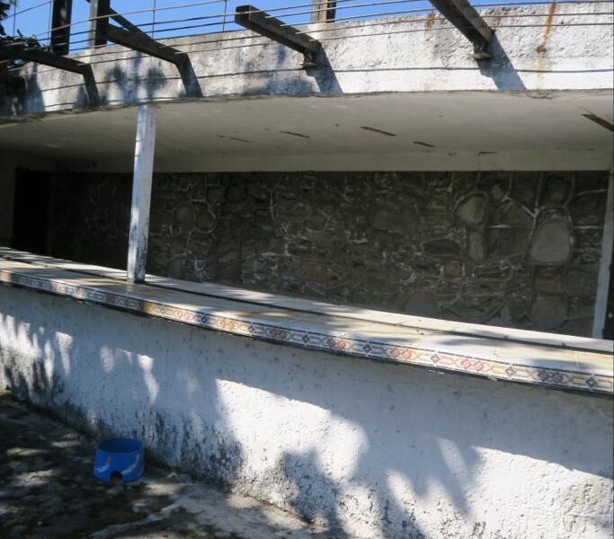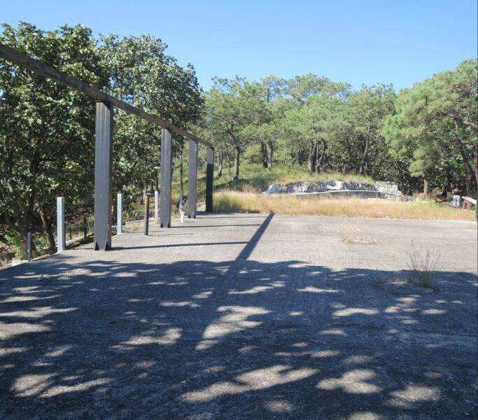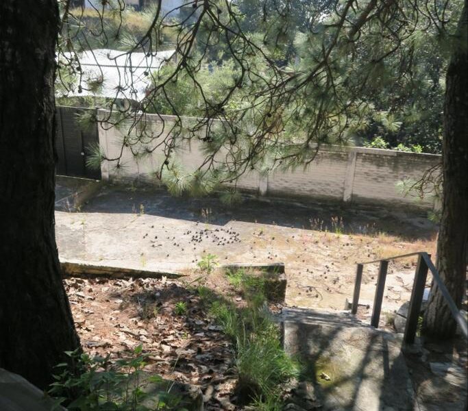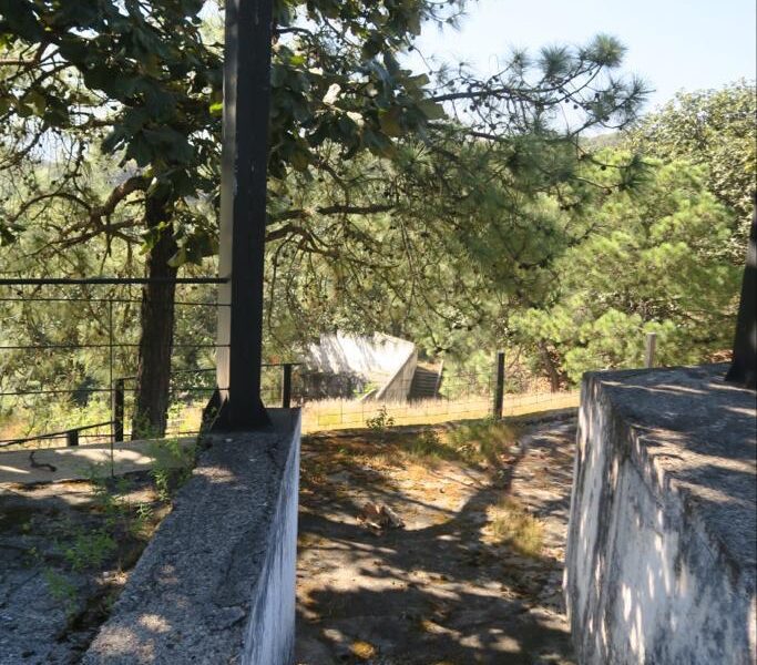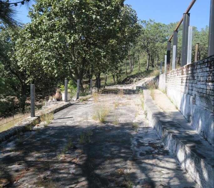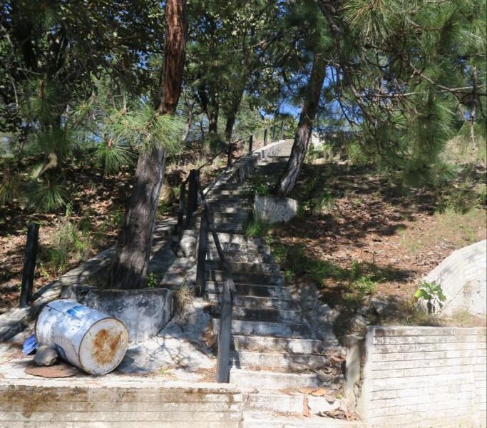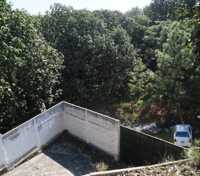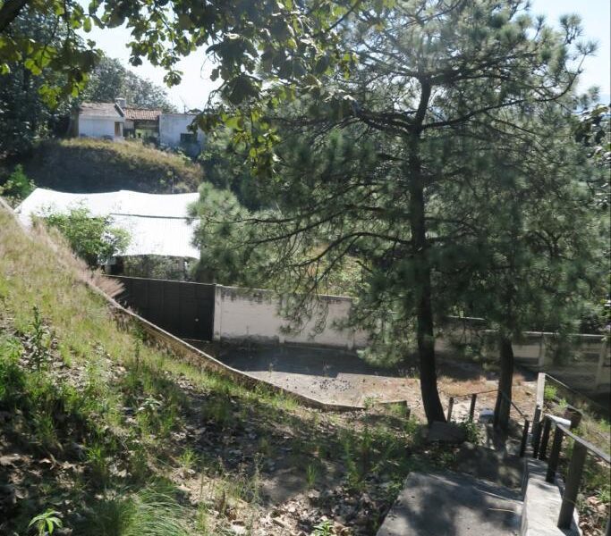 Tiene rampa de acceso a una plancha de concreto para estacionamiento 8 carros. El terreno cuenta con senderos y escaleras para su acceso a diferentes áreas.